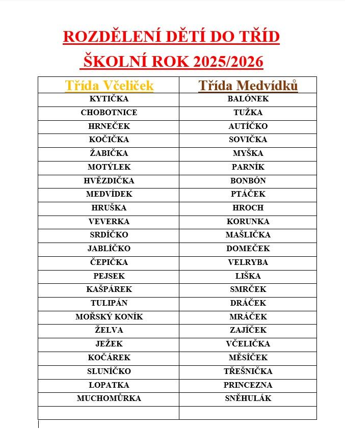 Rozdělení dětí do tříd pro školní rok 2025/2026